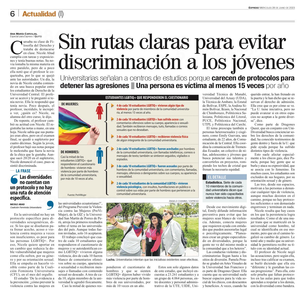 El Diario Expreso, uno de los medios de mayor circulación del país, publicó un reportaje que incluyó cifras y entrevistas sobre la violencia basada en género que vive la población LGBTIQ+ en las universidades ecuatorianas.